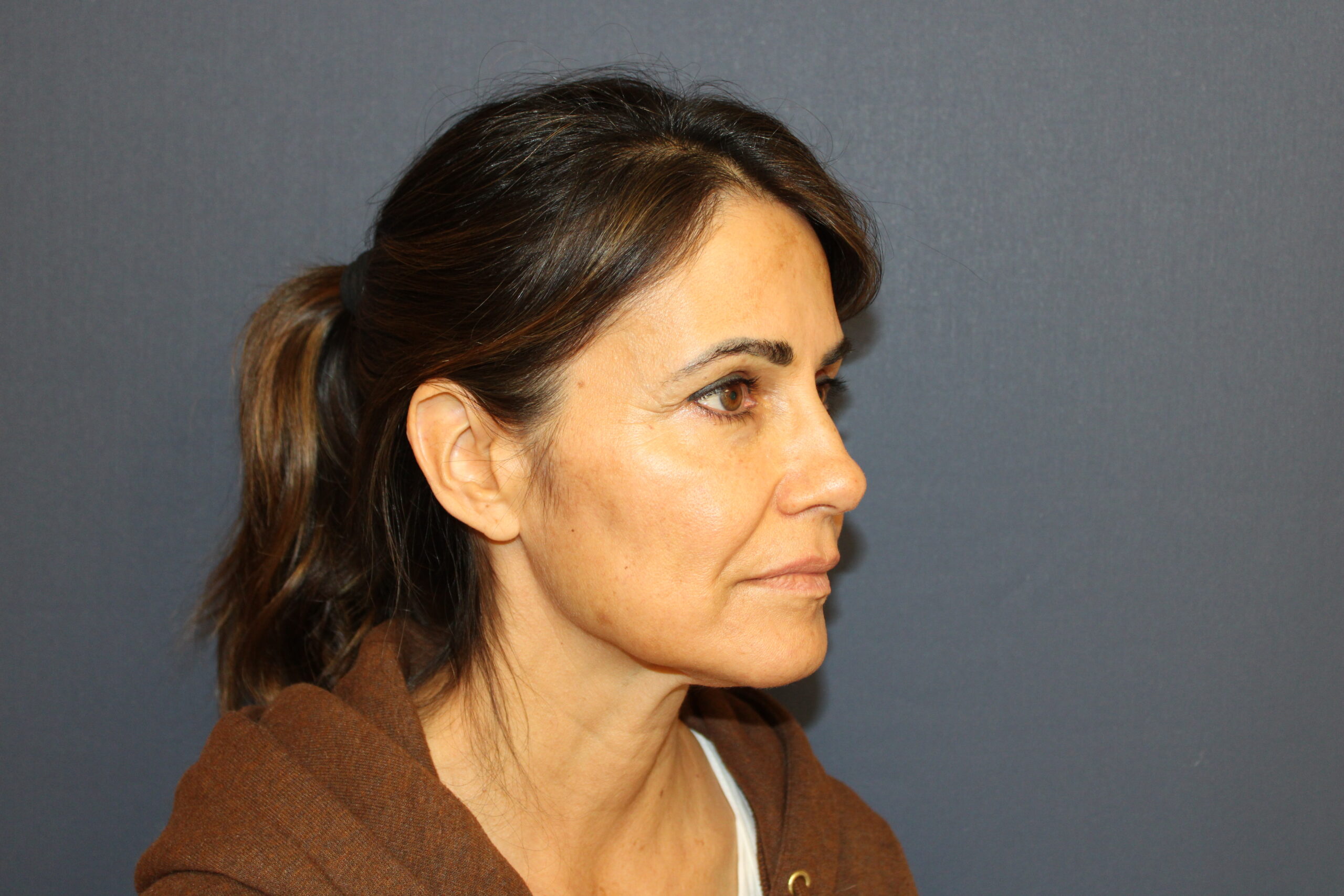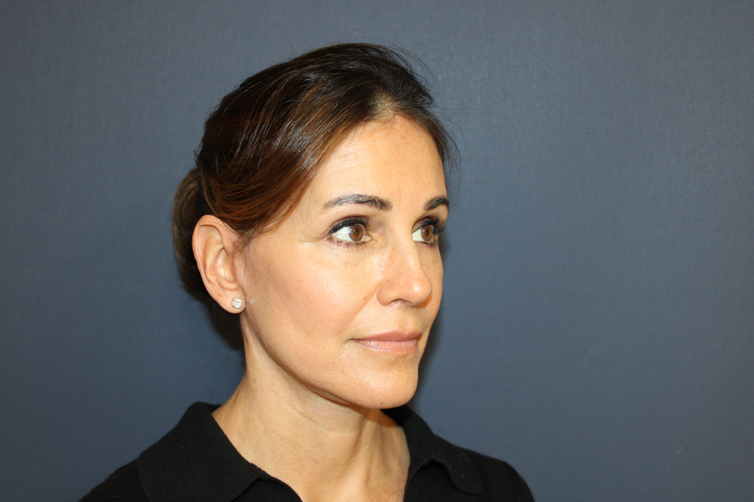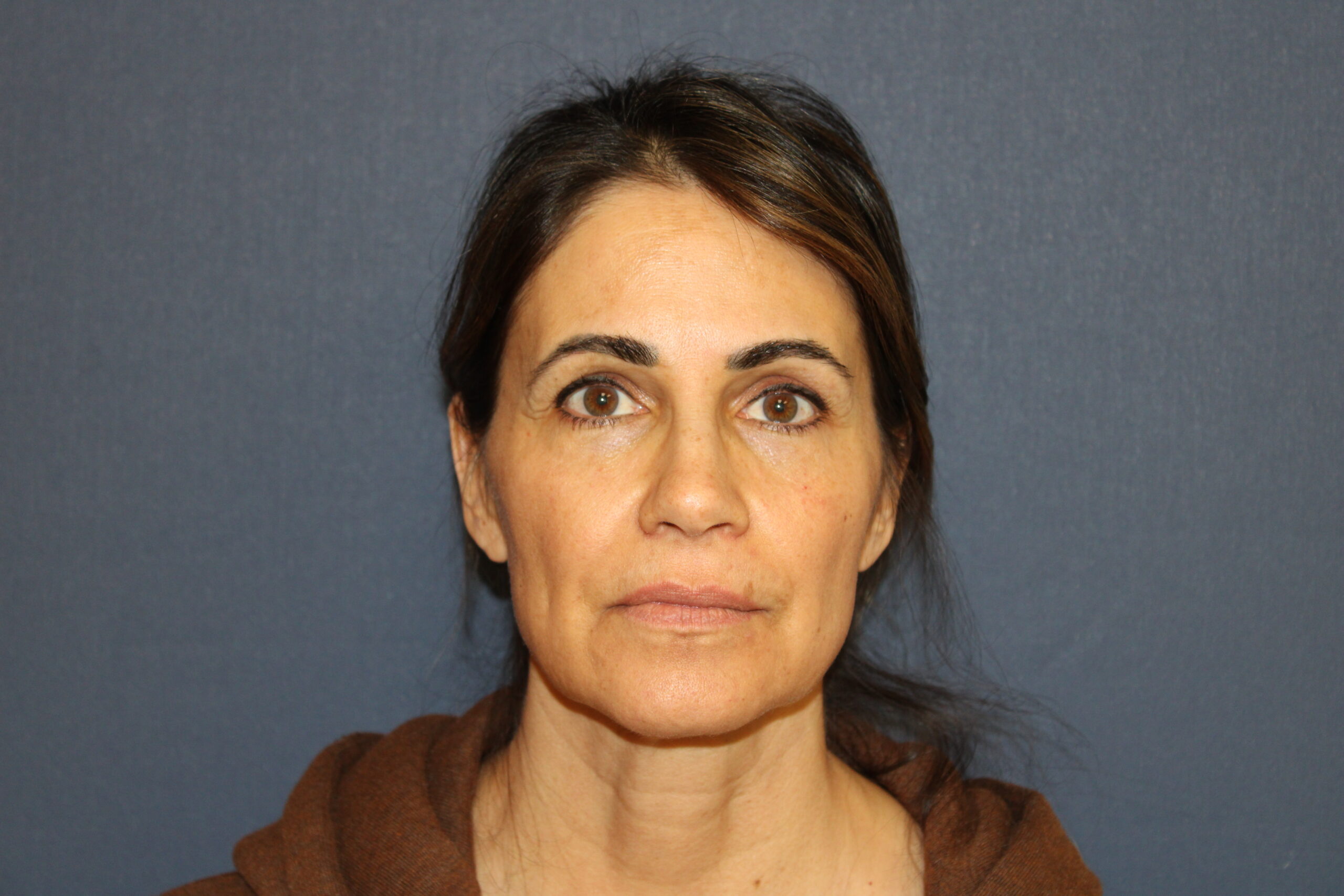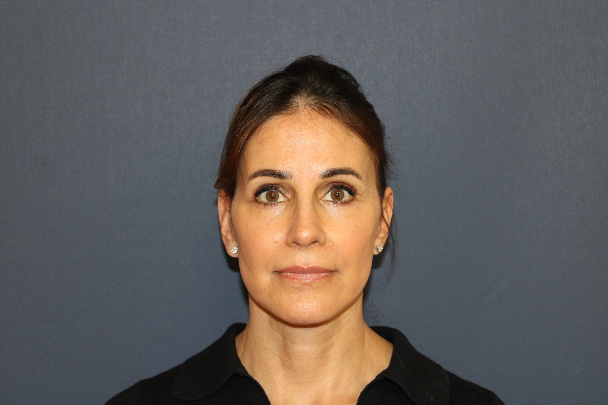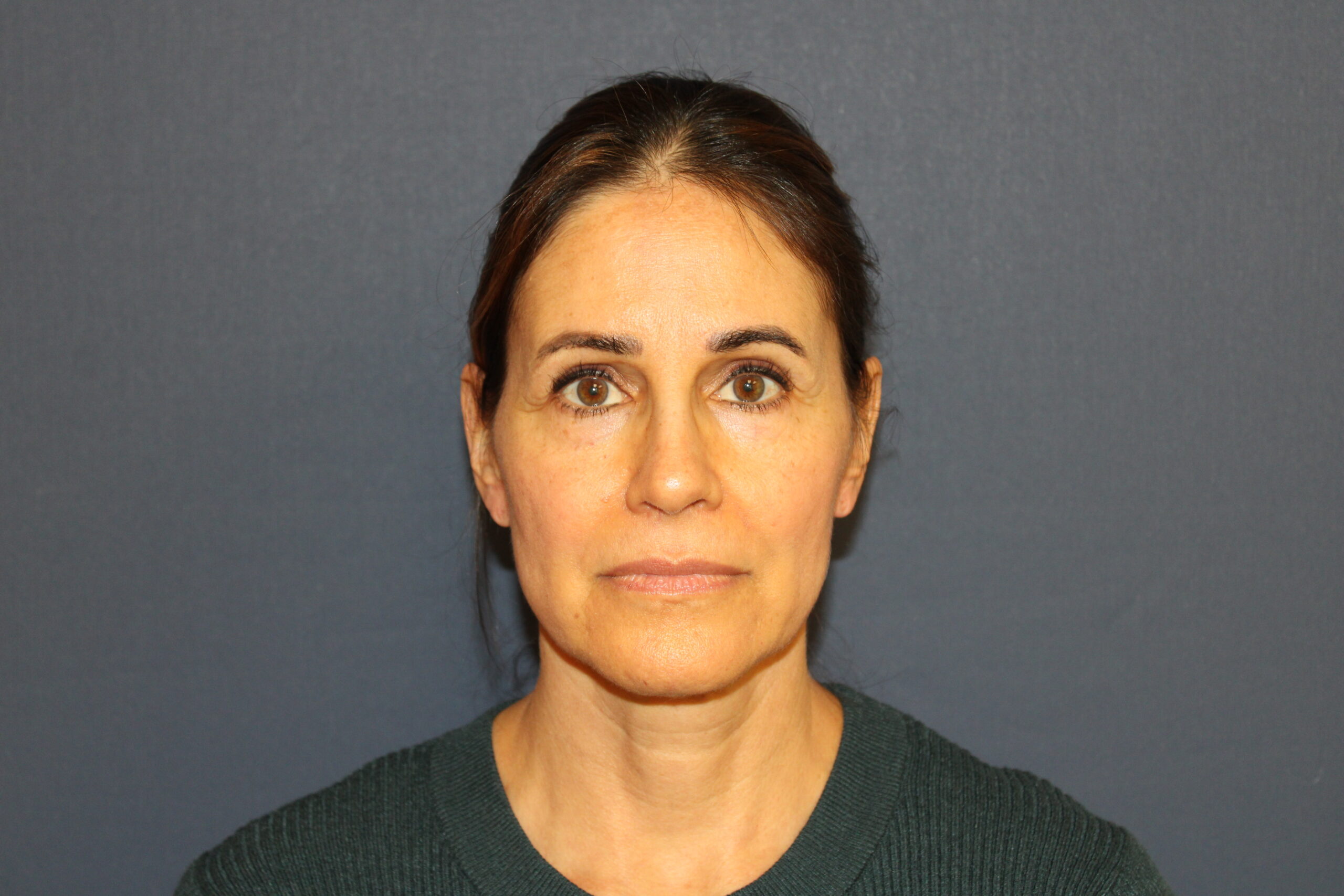 The patient was concerned with cheek, jowl, and neck laxity. She had a history of a prior lower facelift performed many years ago. The patient underwent lower face and neck lift with platysmaplasty. She also underwent upper eyelid blepharoplasty to treat excess skin of the upper eyelids.