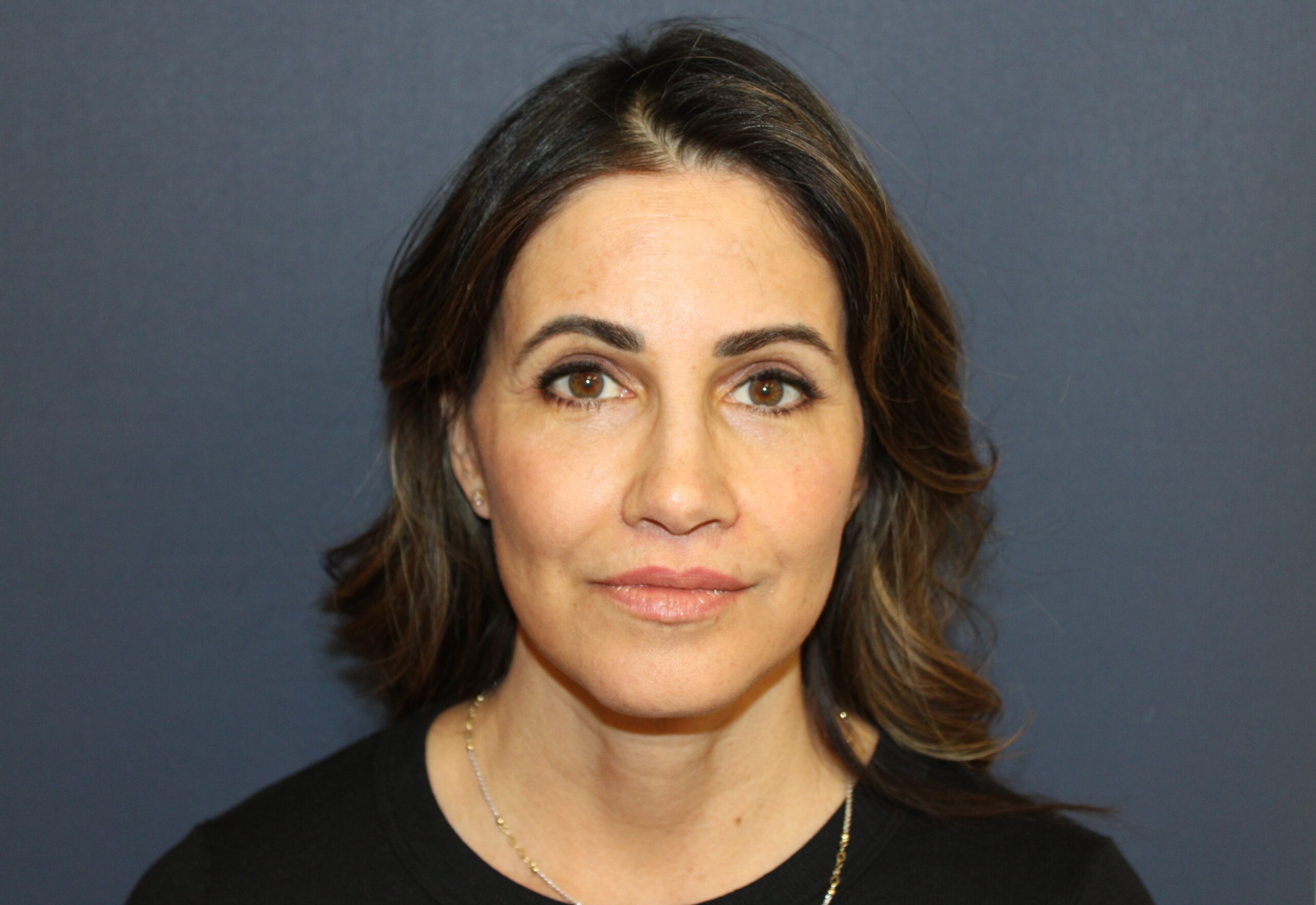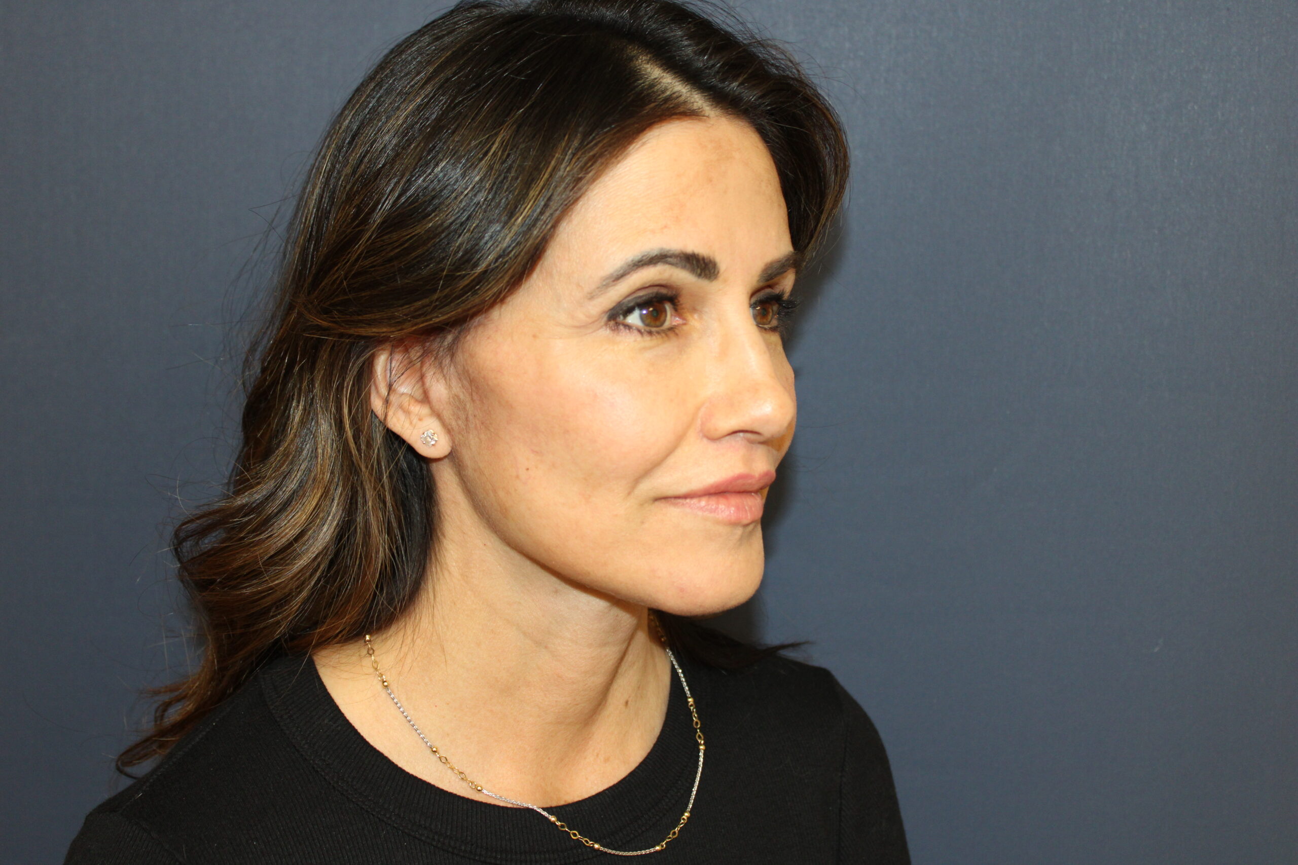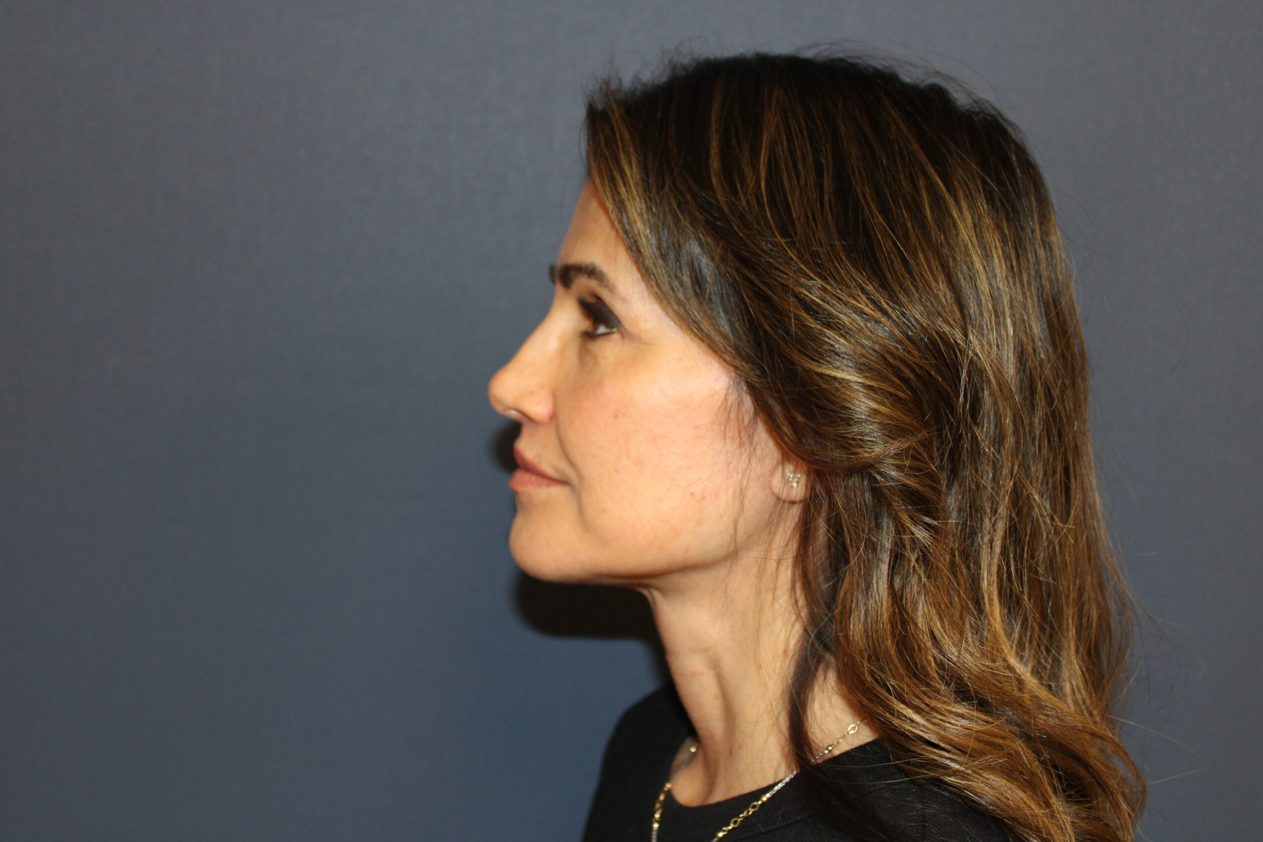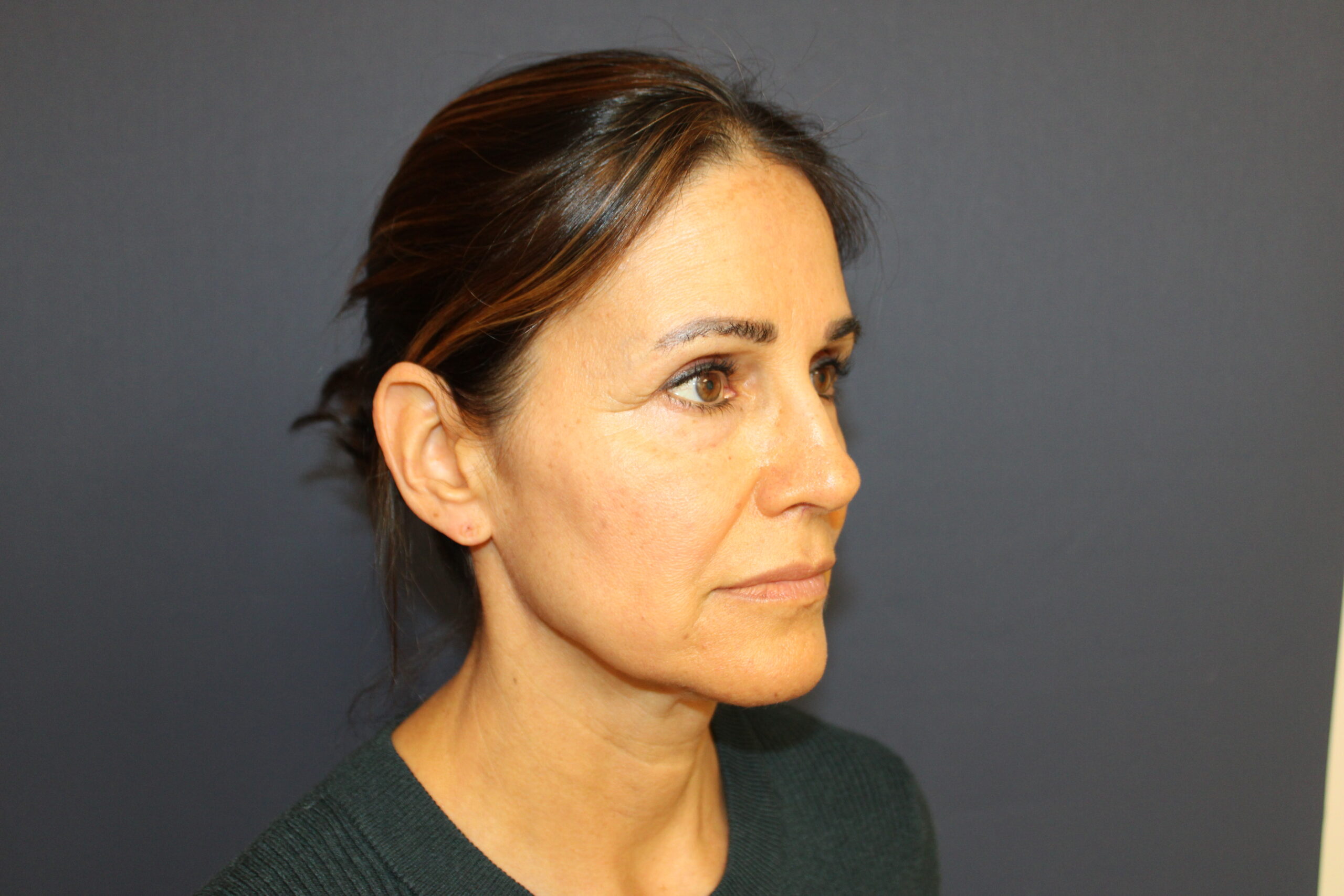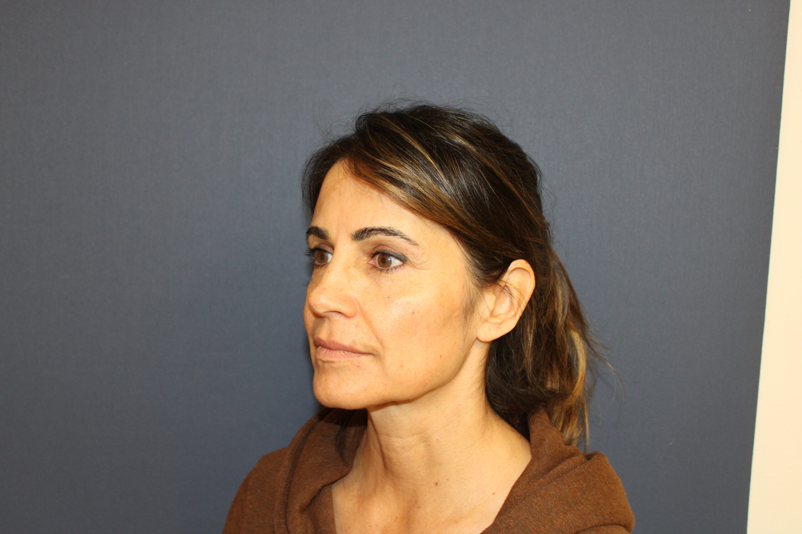 The patient was concerned with cheek, jowl, and neck laxity. She had a history of a prior lower facelift performed many years ago. The patient underwent lower face and neck lift with platysmaplasty. She also underwent upper eyelid blepharoplasty to treat excess skin of the upper eyelids.